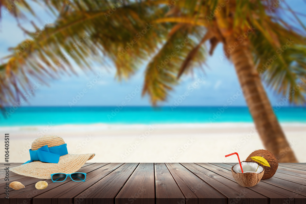 Hat, sunglasses, coconut, shell on beach table. Free space for text. Beach, sea, palm and blue sky in background.