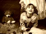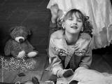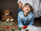 Girl teenager treats wedding accessories. Girl lying on the floor in jeans and barefoot. In the frame of a wedding dress, a teddy bear, a box for an engagement ring