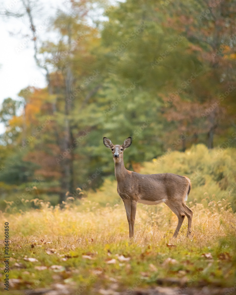 A white-tailed deer doe is seen standing in a forest clearing during autumn. She looks directly at the camera.