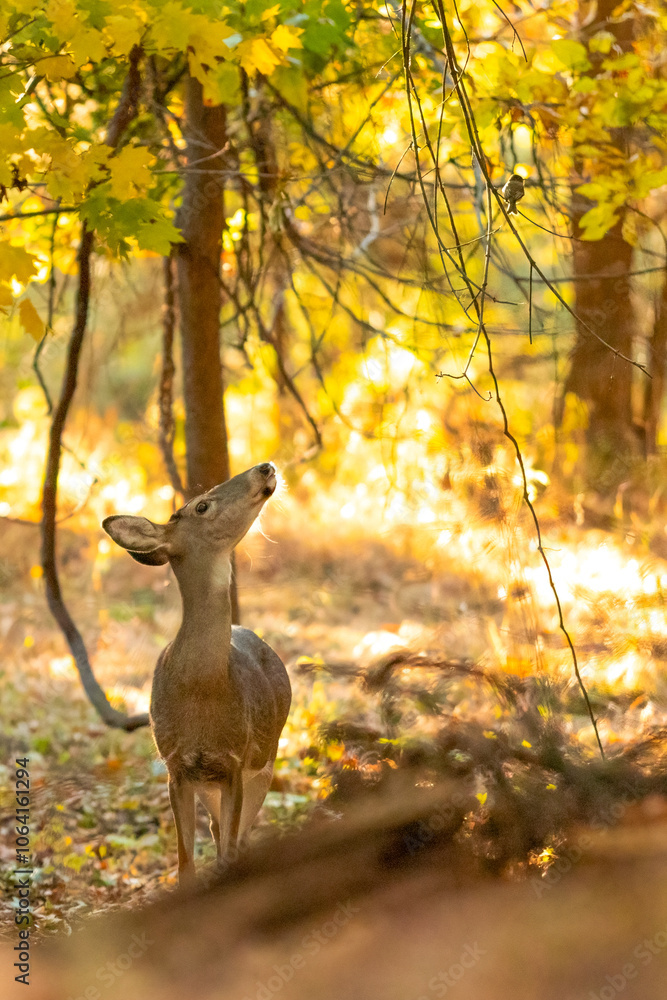 A young White-tailed deer doe stares up at a tree branch, looking at a small bird in an autumn forest. Moments earlier, the same bird landed on her head.
