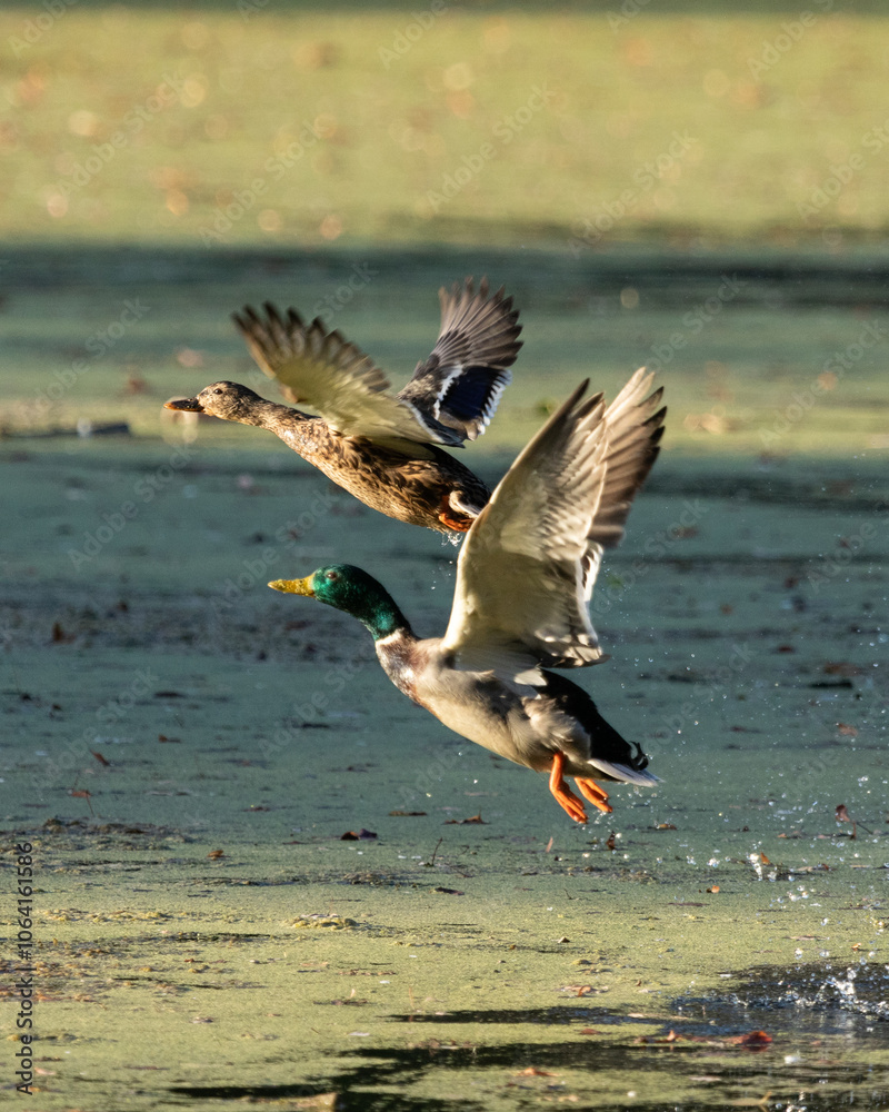 A male and female mallard duck (drake and hen) take off from algae covered water, as they fly during autumn in New Jersey.