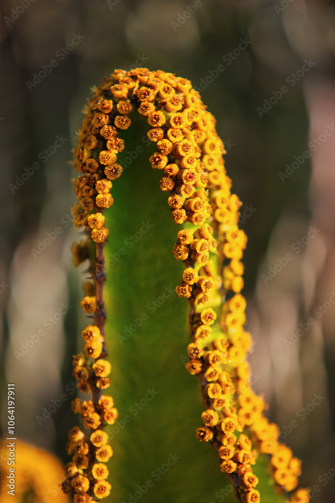 macro flowers of blooming Euphorbia cooperi succulent tree with conspicuous candelabra-like branches
