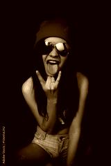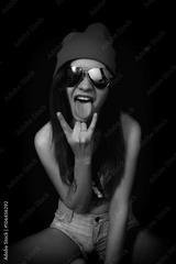 Attractive young woman in a pink knitted cap and sunglasses, showing tongue and making rock hand gesture