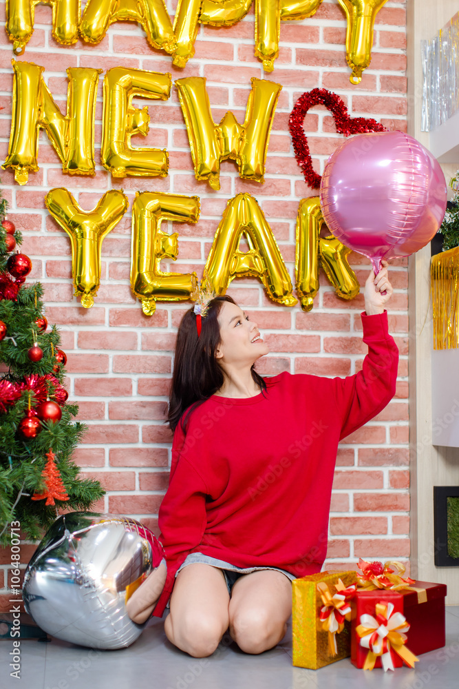 Happy asian beautiful woman wearing red long sleeve knitted sweater holding pink, silver balloons, smiling sitting behind brick wall, funny Happy New Year's party celebration Christmas holiday concept