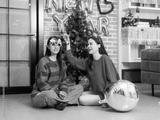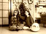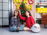 Two happy beautiful Asian women cute best friend female smiling sitting behind the brick wall near decorating Christmas tree at funny Christmas Eve and Happy New Year party celebration holiday concept
