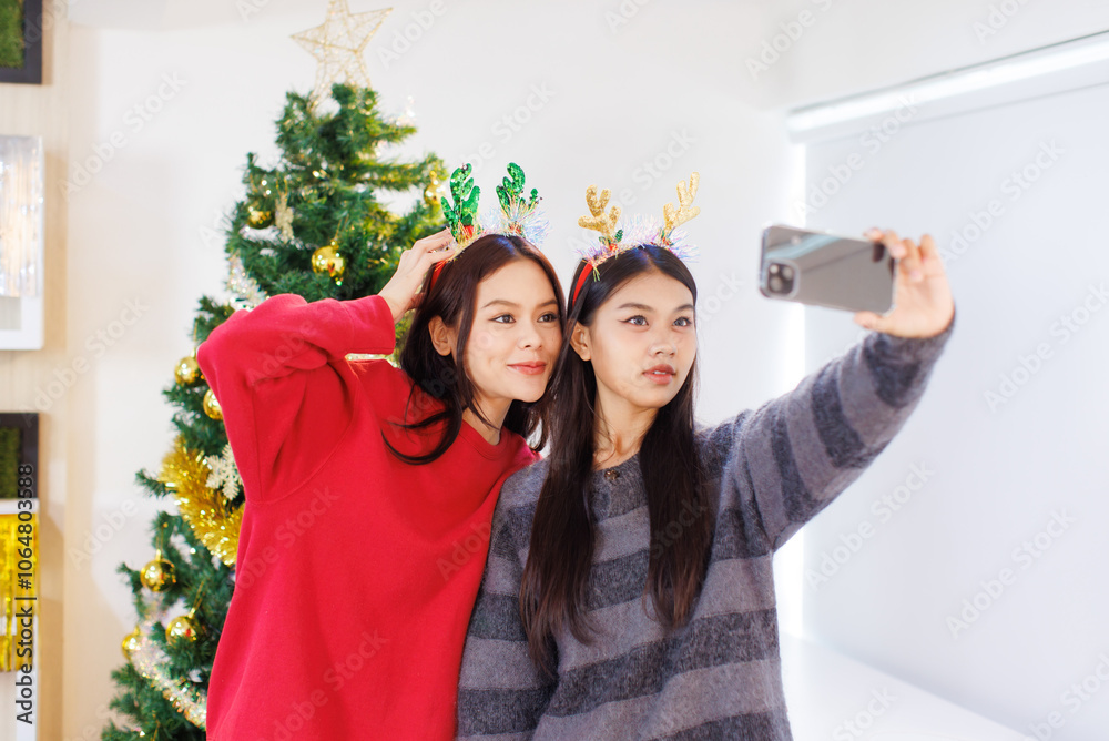 Two happy beautiful Asian women cute best friend female smiling selfie photo with smart mobile phone enjoy party near decorating Christmas tree funny Christmas Eve Happy New Year celebration holiday.