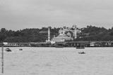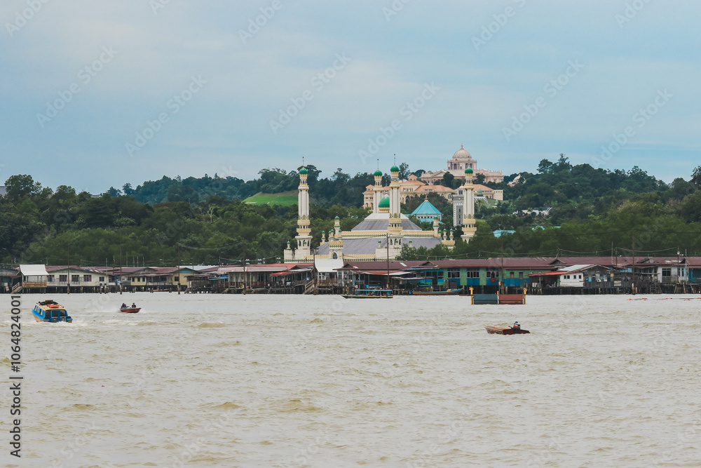Brunei waterfront view showcasing traditional houses and a mosque under cloudy skies