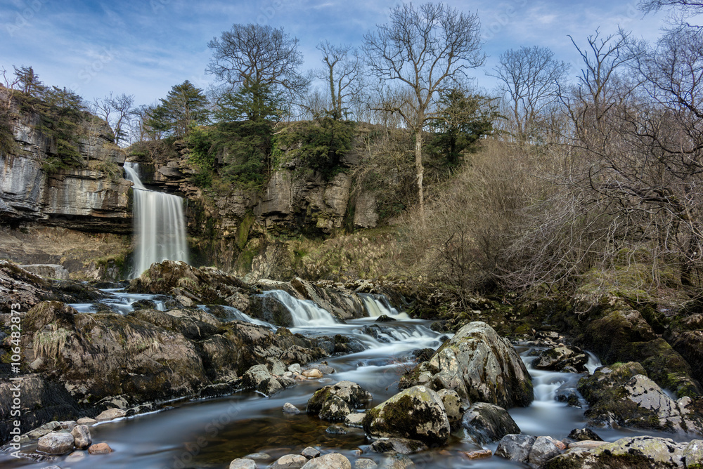 Wide angle view of Thornton Force Waterfall in the Yorkshire Dales National Park with small cascading waterfalls in foreground.