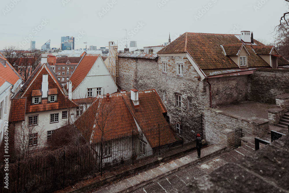 Historic rooftops of Tallinn with modern skyline in the distance on a cloudy day