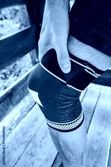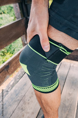 Athlete with a knee bandage during outdoor fitness activity, showcasing support for an injury
