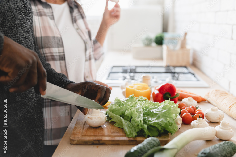 Cropped closeup image of african-american couple spouses cooking preparing vegetarian vegan food meal together at home kitchen, cutting vegetables for salad. Love and relationship concept