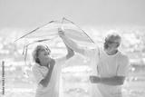 Grandfather and kids play on summer beach