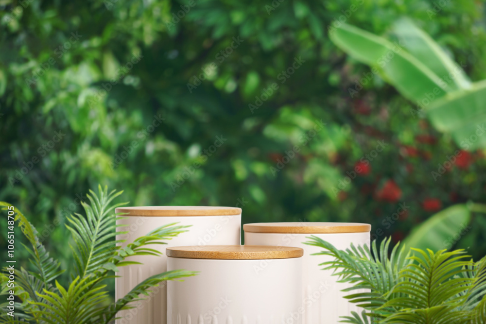 Minimal podium table top outdoors blur green leaf tropical forest plant background.beauty cosmetic healthy natural product placement pedestal display,jungle paradise concept.
