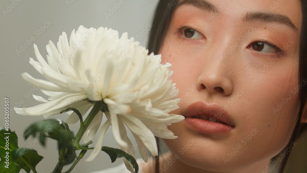 Two sensual multiethnic girls holding tropical flowers faces natural skin cosmetology bloom multiracial Japanese Asian Chinese Caucasian females women eco cosmetics organic softness spa beauty routine