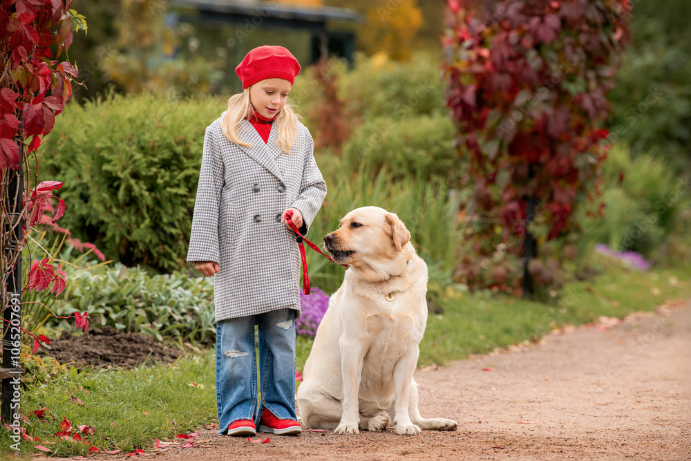 little girl in a red beret and coat walks with a Labrador dog on a leash along a path in an autumn park.