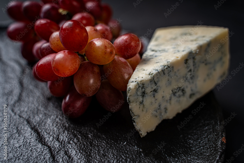 Blue blue cheese Garganzola or Dor Blue with a bunch of red grapes on a black mica board on a dark background. Space for text.