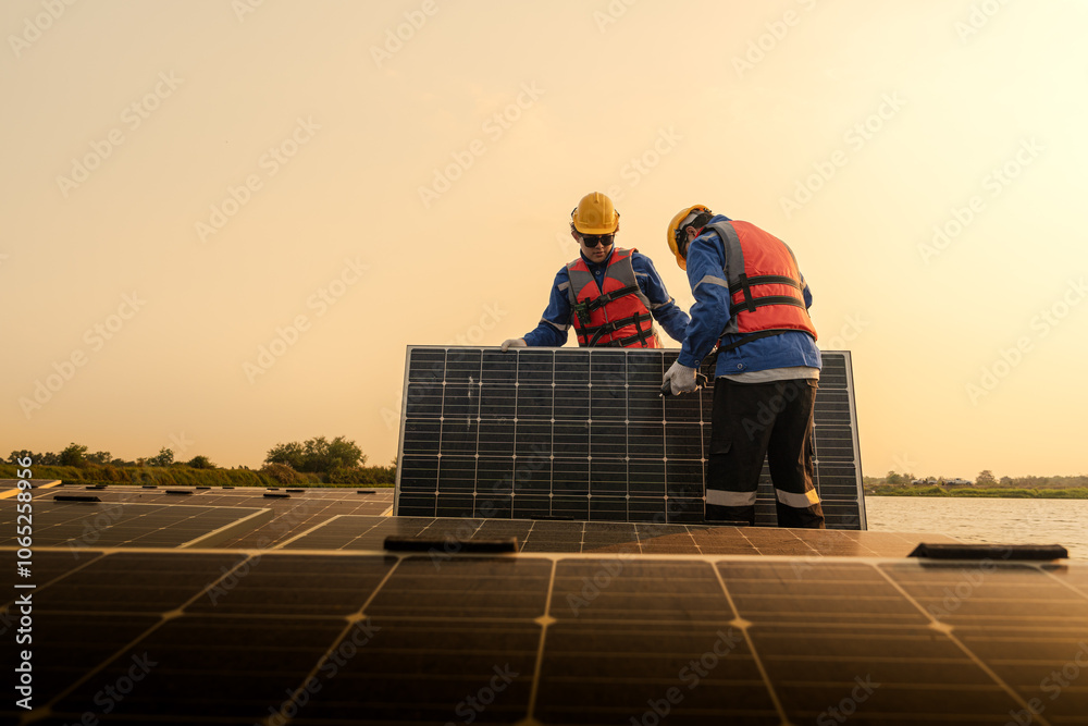 Male workers repair Floating solar panels on water lake. Engineers construct on site Floating solar panels at sun light. clean energy for future living. Industrial Renewable energy of green power.