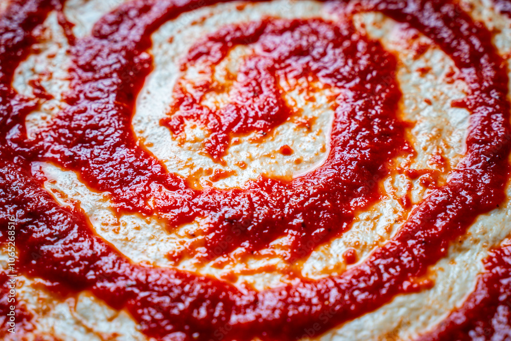 A circle of pizza dough is covered with tomato sauce in the form of a spiral. The process of making pizza. Background with the texture of dough and red sauce. Close-up,