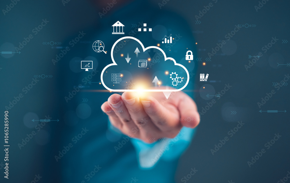 Person holding digital cloud with technology icons representing cloud computing, data storage, and internet services concept.