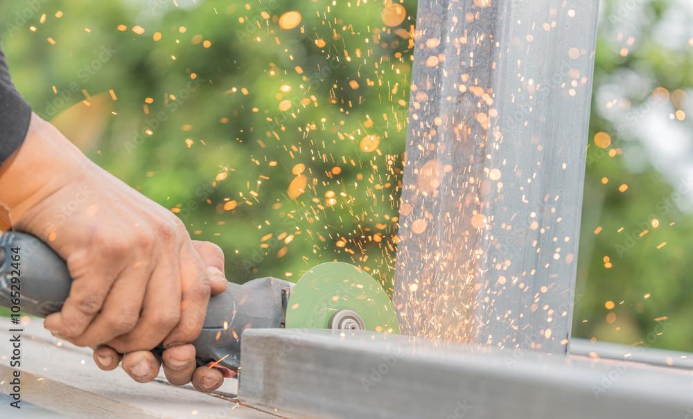Electric wheel grinding on steel structure in factory, Sparks from the grinding wheel, Worker hand Grinding machine