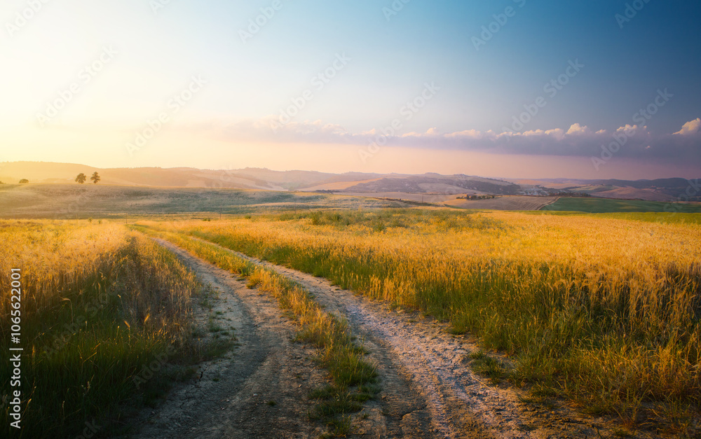 Beautiful italian summer mountain rural landscape; Panorama of summer golden field with dirt road and Sunset cloudy sky
