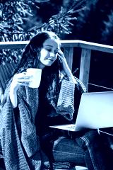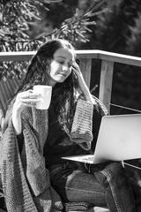 Beautiful young woman sitting on balcony terrace wrapped in yellow plaid holding cup of tea coffee, working at laptop. Brunette girl works remotely.