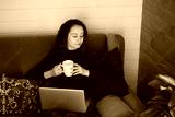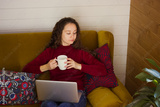 Young woman relaxing on sofa indoors at cozy home. A girl with cup of tea, coffee in hand and laptop. Online, remote work. People in modern interior.