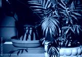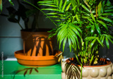 Green houseplants. Palm tree in a stylish pot. Home plants in interior. The plants, flowers on a shelf with contrast shadows in sunny day. Home garden