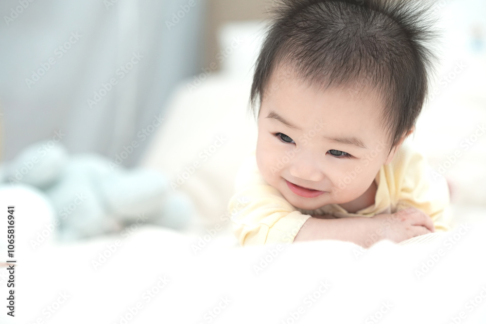 Baby Tummy Time on Soft Cushion with Curious Expression