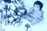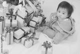 Joyful Baby Holding Christmas Gift by the Tree