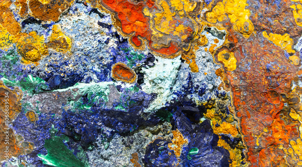 Azurite or Azure spar, malachite on limonite matrix with chrysocolla. Abstract natural photo
