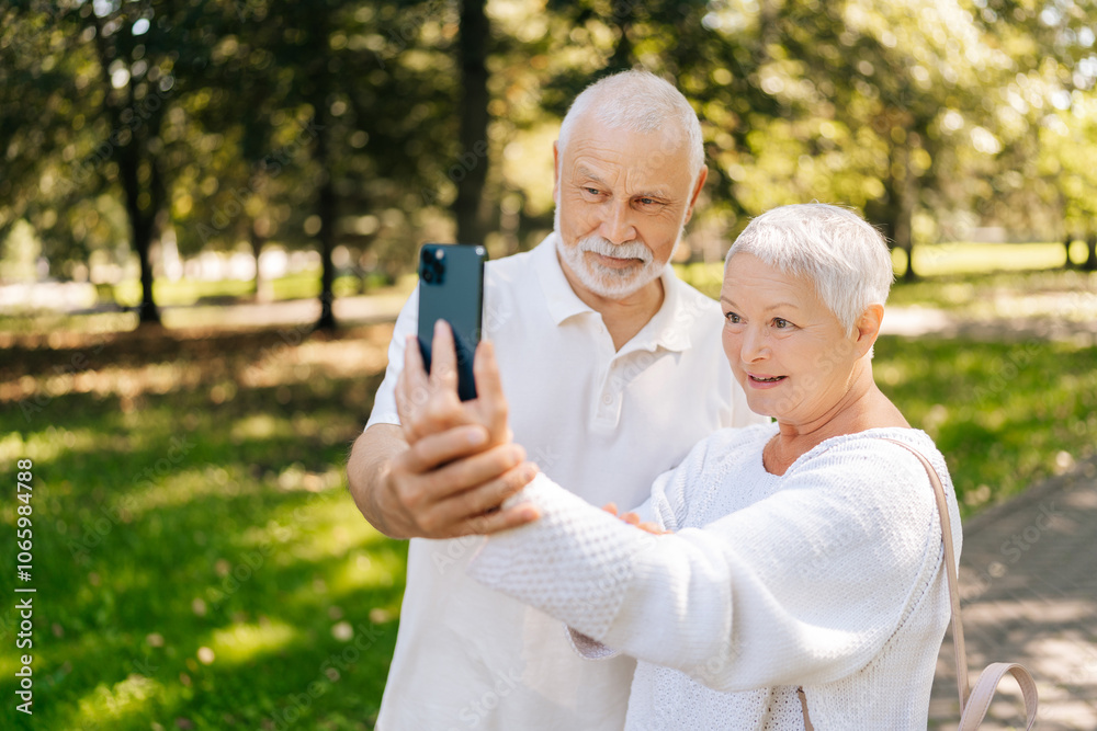 Happy elderly couple enjoying video call while strolling in sunny summer park. Joyful gray-haired wife and husband enjoying video call outdoors surrounded by natural beauty on sunny day.