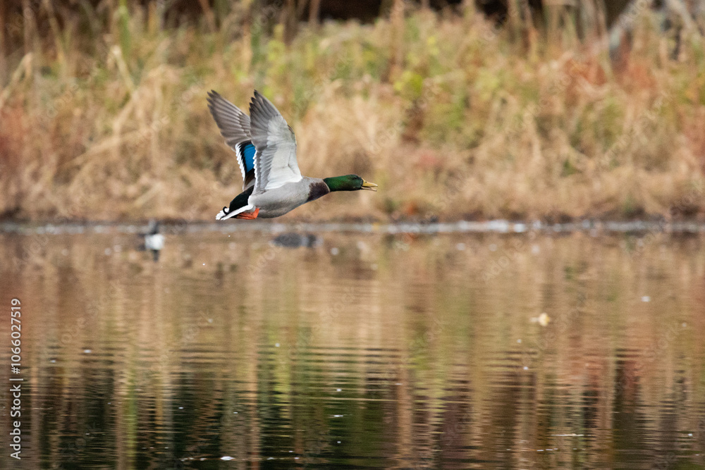 A Mallard drake flies over a pond during autumn. The surrounding area is warm with fall foliage.