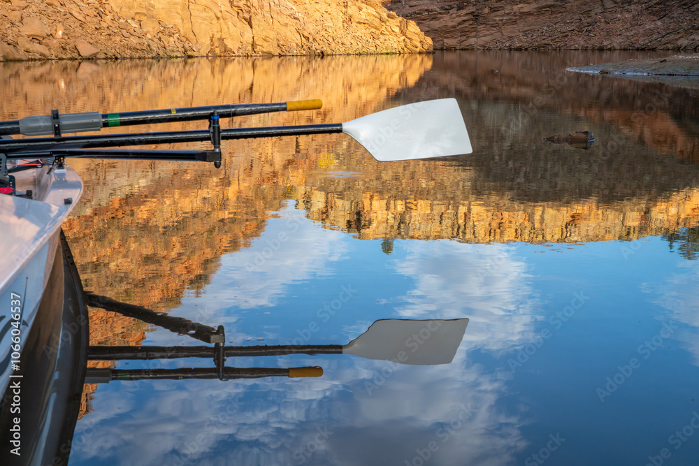 oars of coastal sculling shell in sandstone canyon of Horsetooth Reservoir in Colorado in fall scenery