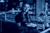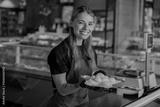 A cheerful fishmonger is showcasing a variety of fresh seafood in a vibrant and bustling market setting