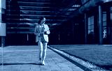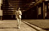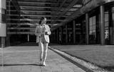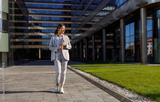 A professional woman dressed in an elegant suit is confidently walking through a modern office environment