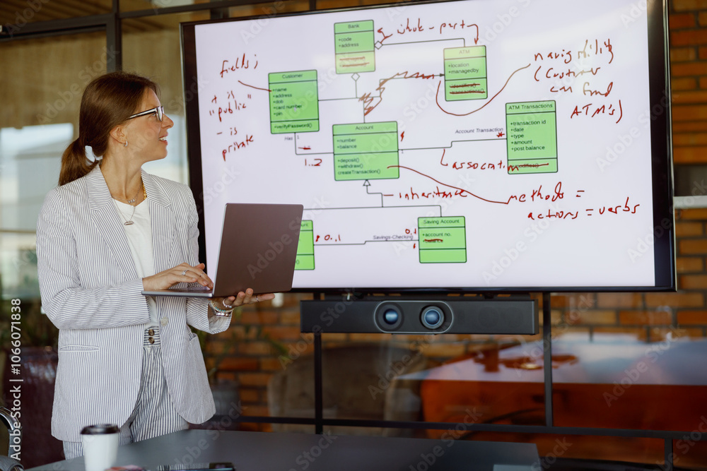 A professional woman confidently presenting a detailed data flow diagram in a sleek, modern office environment