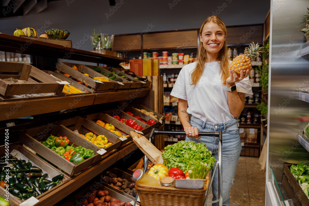 A woman joyfully shopping for fresh fruits and vibrant vegetables in a lively local market filled with colors