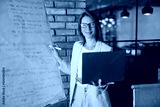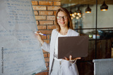 A confident businesswoman delivering an impactful presentation using her laptop in a sleek, stylish office space