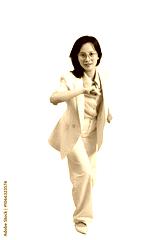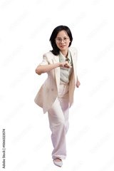 Young Asian businesswoman wearing white jacket on purple background