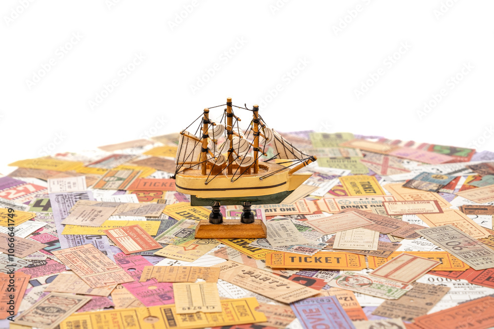 Ship model with sails on a bunch of vintage tickets from around the world, theater, movie, concerts, transport, hotel reception cards and other documents