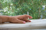 Hand holding a cigarette, surrounded by greenery, depicting smoking outdoors.