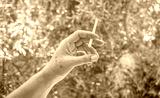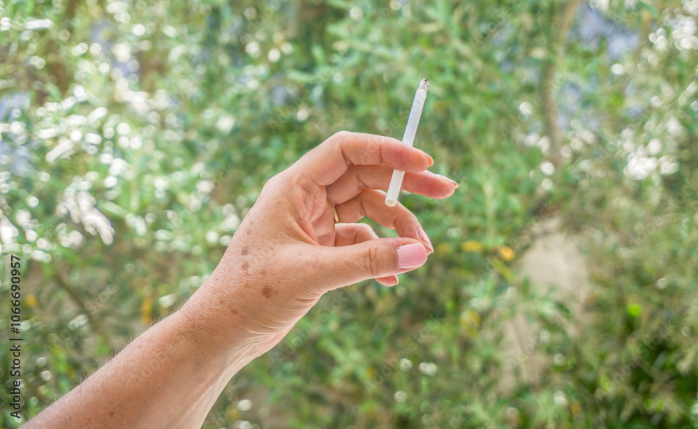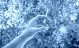 Hand holding a cigarette, surrounded by greenery, depicting smoking outdoors.
