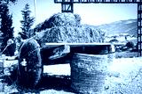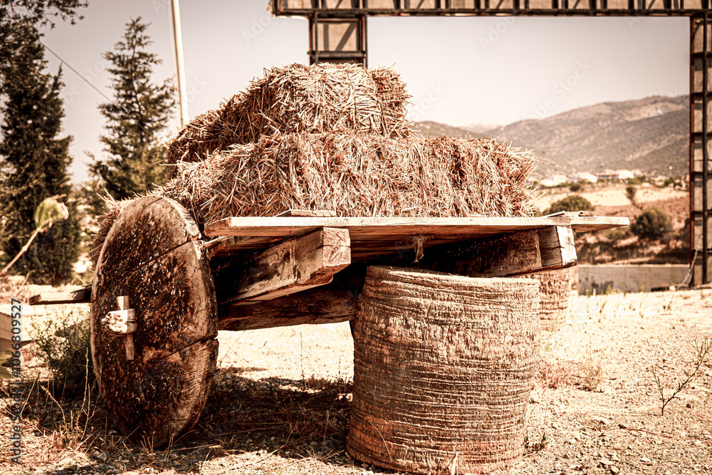 Vintage wooden cart loaded with hay bales, set outdoors, reflecting a rustic countryside feel.