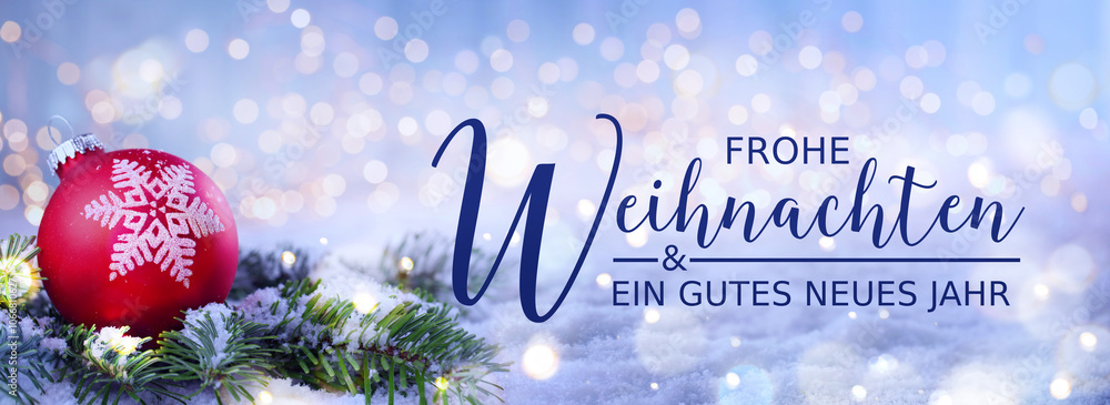 Christmas greeting card german text - Merry Xmas and happy new year - Snow background with Christmas tree decoration in snow landscape - background, banner, panorama