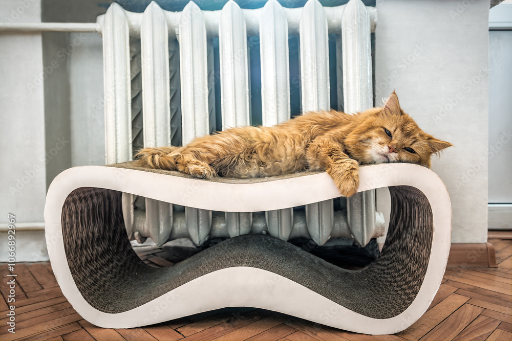 Ginger cat resting on the corrugated cardboard scratching near heating radiator