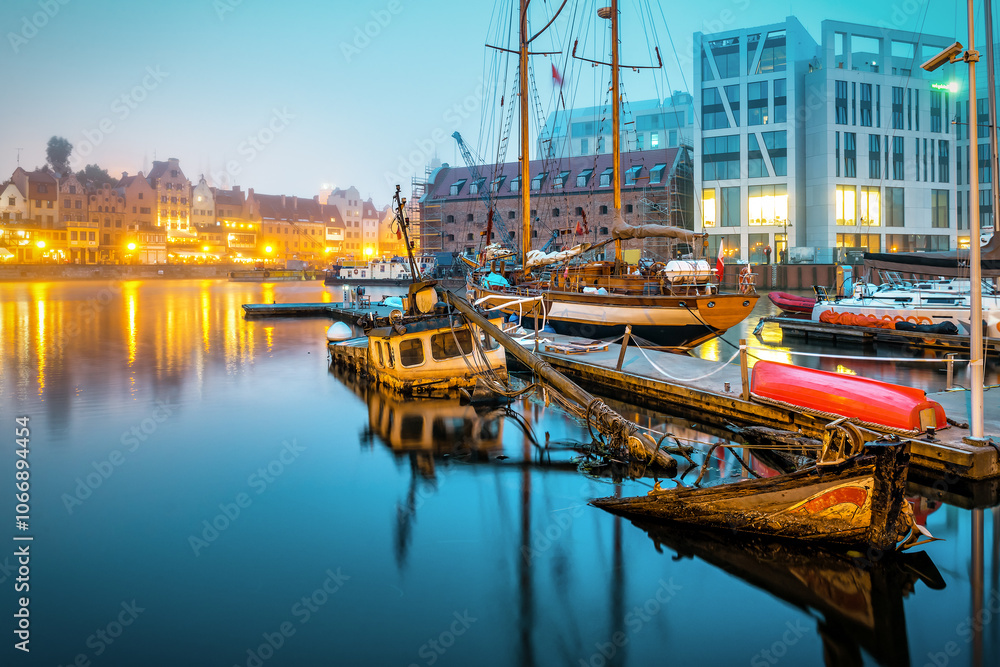 Sunken boat ship in a bay of Gdansk in the evening