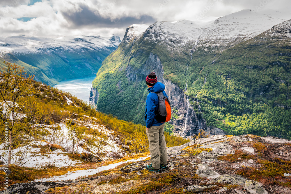 Tourist man standing on the rock over Geiranger fjord, Norway