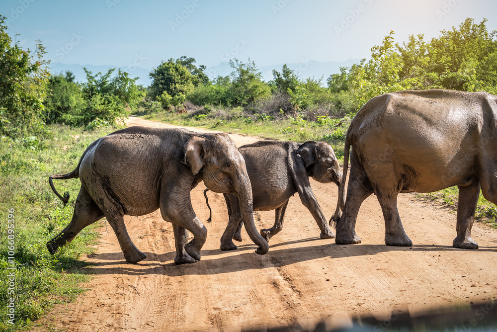 Walking Elephants in the wilderness national reserve on Sri Lanka