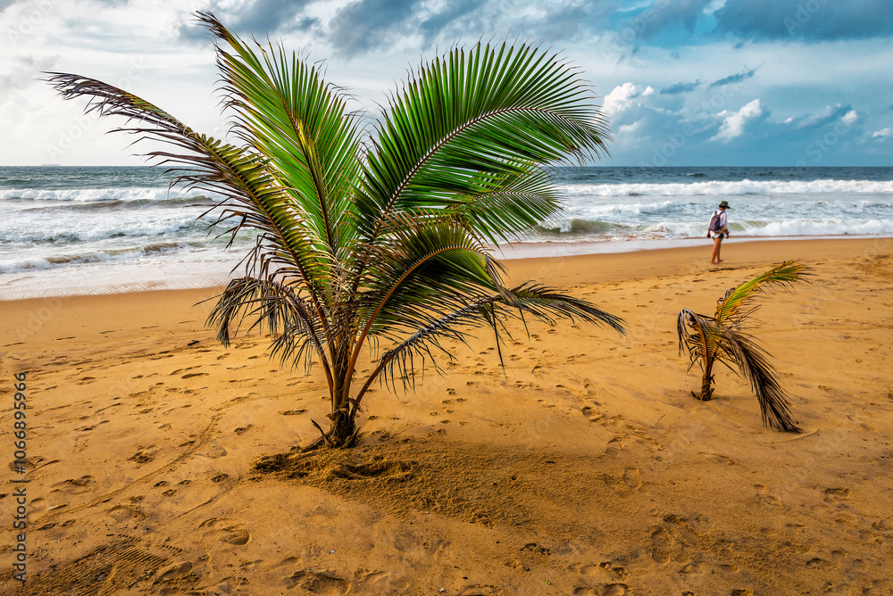 Young coconut palm seedlings on the tropical beach, tourist woman at sunset